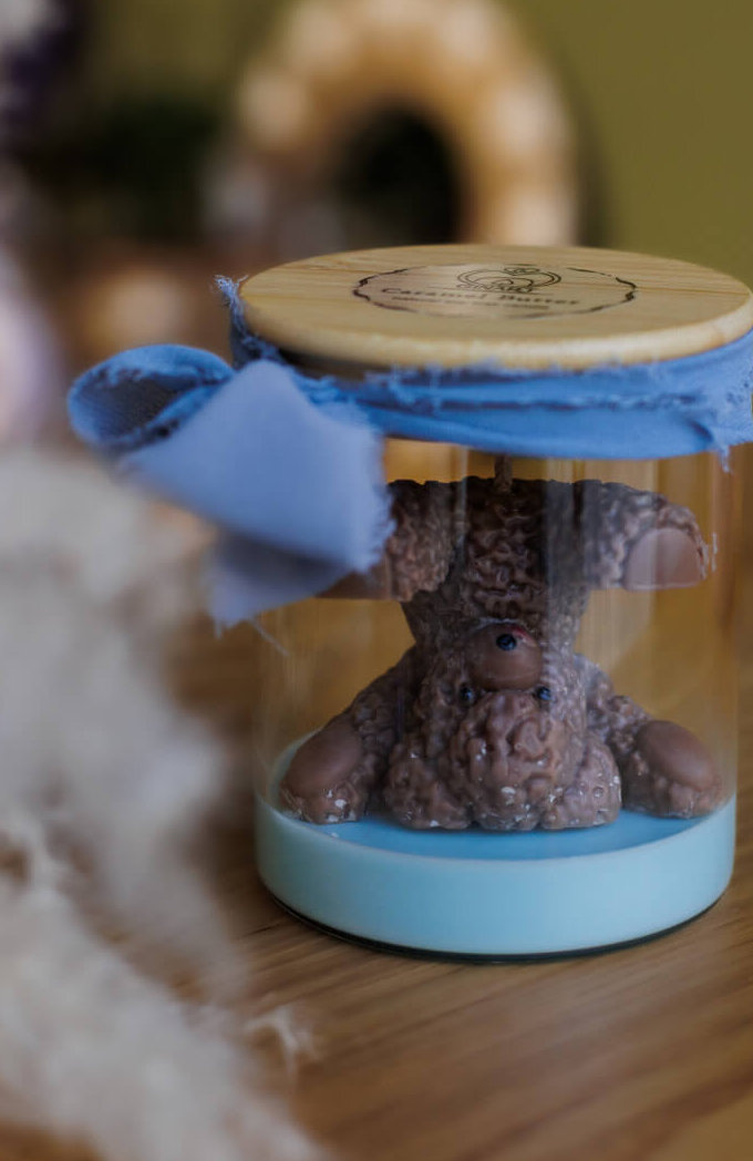 Χειροποίητο κερί σόγιας σε γυάλινο βαζάκι με ξύλινο καπάκι και σιφόν κορδέλα. Στο εσωτερικό, ένα χαριτωμένο αρκουδάκι από χειροποίητο κερί σόγιας δημιουργεί παιχνιδιάρικη, διακοσμητική πινελιά που προσθέτει χαρακτήρα και στυλ. Ιδανική επιλογή ως ξεχωριστό δώρο!